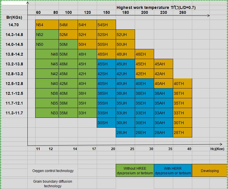 * Density: 7.4~7.6g/cm³; αBr: -0.09~-0.13%/℃; αHcj: -0.50~-0.80%/℃ ; Hardness: Hv 600 ;
